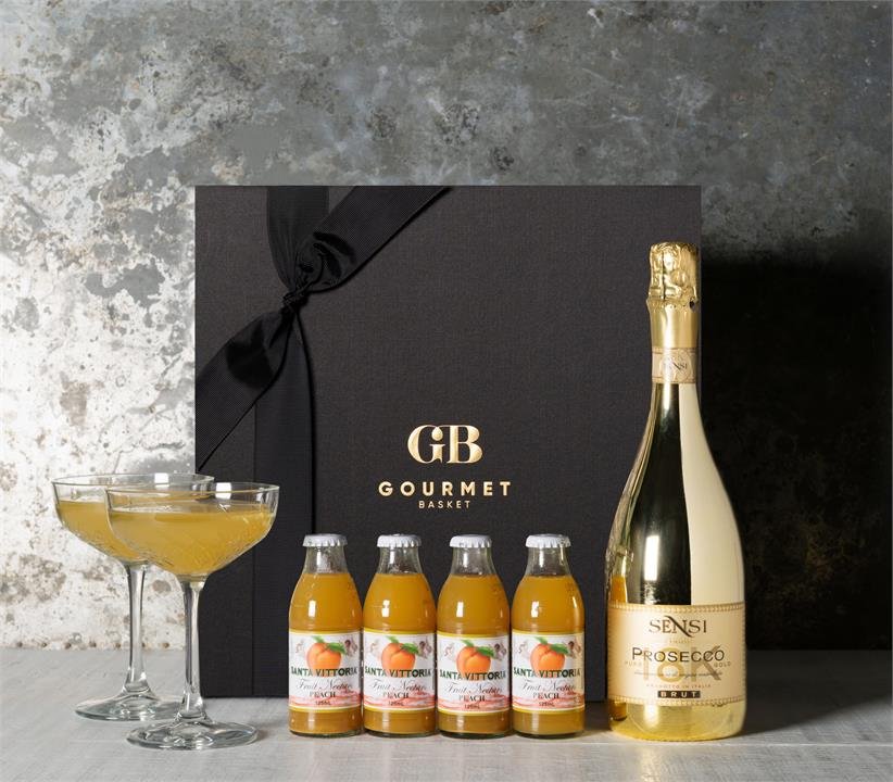 Introducing the Bellini Celebration Hamper, the perfect indulgence for those who appreciate the finer things in life. This exquisite gift hamper is designed to elevate your special moments and create a luxurious experience like no other. Included in this gift hamper is luscious peach fruit nectar, and a bottle of premium Prosecco, a sparkling wine from Italy that is renowned for its crisp and fruity character. To complete your Bellini experience, we have included two elegant cocktail coupe glasses, these timeless glasses exude sophistication and style, adding a touch of elegance to any occasion. Indulge in the Bellini Celebration Gift Hamper and elevate your special moments to new heights.
