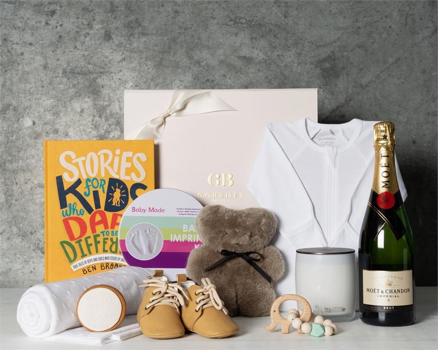Welcome the new arrival with this gorgeous baby hamper, full of beautiful and practical items to make life with a new baby that little bit easier (and more stylish)! The FLATOUTbear Baby Latte plush toy is perfect for cuddles, the Little Edie Baby Shoes Maya Boots are both practical and chic, and the Baby Made Baby Imprint Kit lets you capture those precious first moments forever. There’s also a delicious Baby Cookie, a scented candle to help mama relax, and a copy of Stories for Kids Who Dare to be Different – perfect for reading aloud at bedtime. Also included is a bottle of Moet & Chandon Brut Imperial Champagne – because every celebration deserves bubbles!