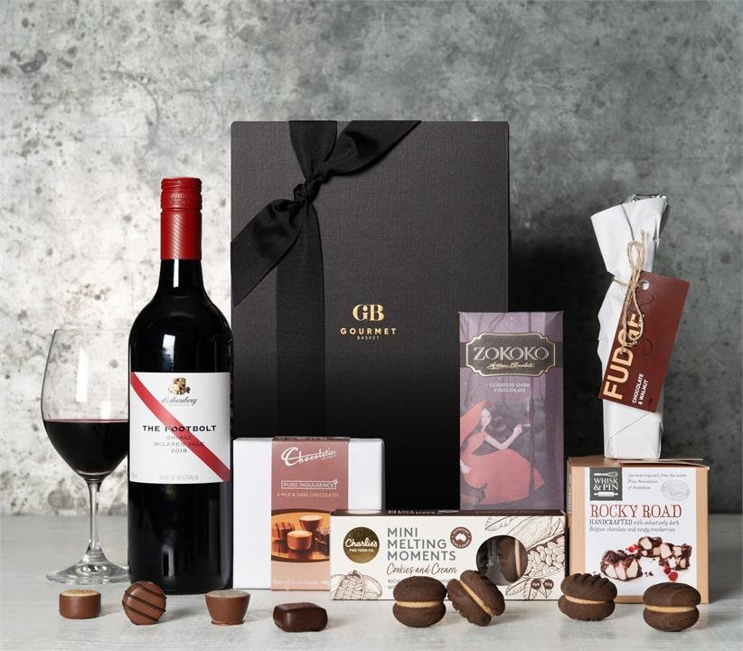 They’ll love the yummy chocolate treats and delicious red wine all impeccably presented in our stylish Gourmet Basket signature gift box.