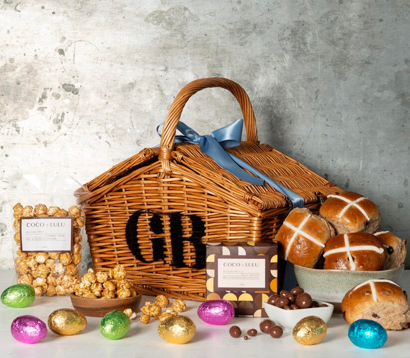 To satisfy any sweet tooth, the basket includes an array of delectable treats such as 6 traditional hot cross buns, 8 Chocolatier Milk Chocolate Hunting Easter Eggs, Coco and Lulu Caramel Pecan Popcorn and Coco and Lulu Milk Chocolate Fruit and Nut Mix.