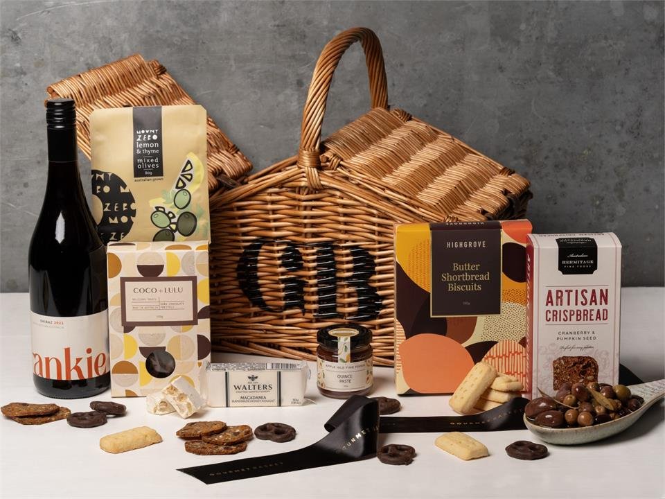 Gourmet Basket’s signature picnic basket with a collection of gourmet treats and a bottle of Shiraz!
