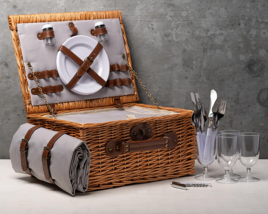Discover the joy of outdoor dining with this classic 4 person picnic basket. Crafted from wicker and finished with a classic grey stripe fabric with insulated cooler section and picnic blanket.