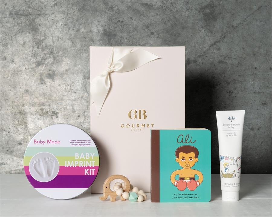 - Stylishly presented in our Gourmet Basket Signature Baby Gift Box finished with ribbon, tissue and gift card