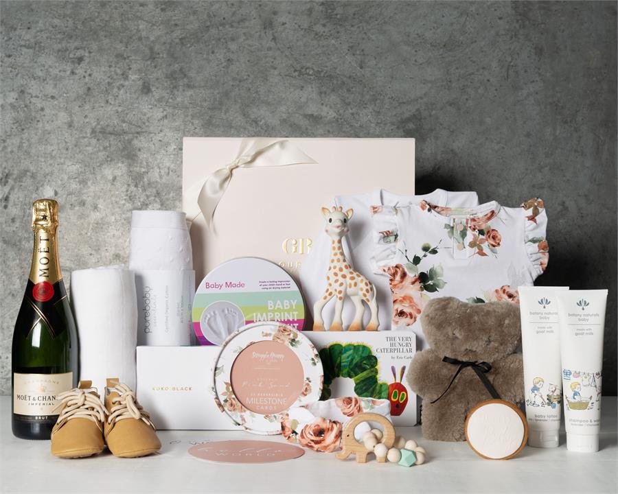 - Stylishly presented in our Gourmet Basket Signature Baby Gift Box finished with ribbon, tissue and gift card