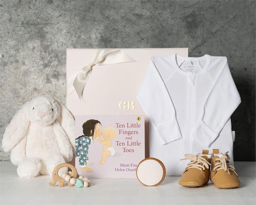 Introducing the Ten Little Fingers Baby Hamper – the perfect gift for any new parent! This hamper includes a pure baby growsuit, a soft bunny, the iconic Ten Little Fingers and Ten Little Toes baby book, a baby cookie, an elephant teether and baby shoes. The Ten Little Fingers and Ten Little Toes baby book is sure to make this special time even more memorable.